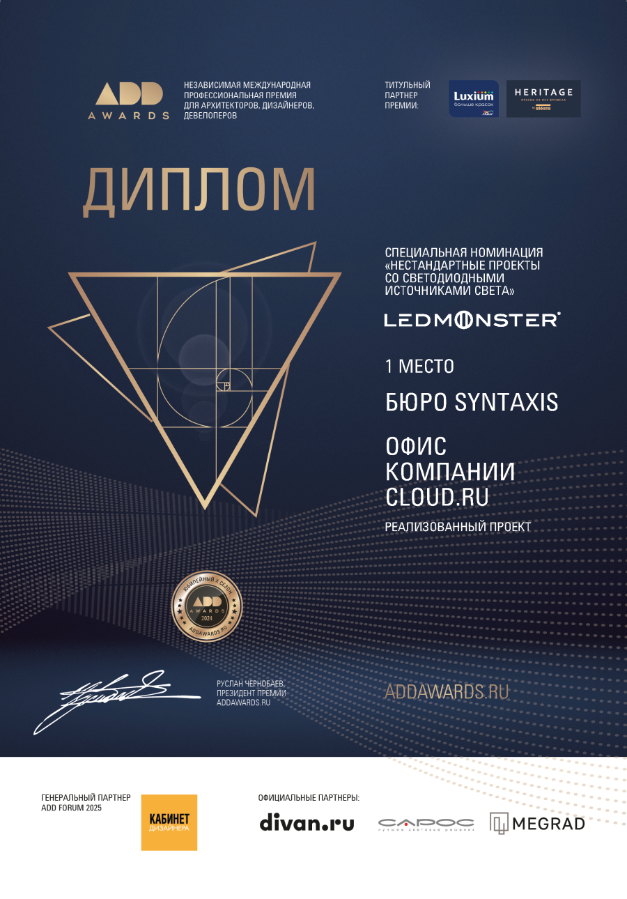 Цель проекта — создать технологически продвинутое деловое пространство для динамично развивающейся российской IT-компании. Новый офис расположен в бизнес-центре многофункционального кластера Lucky в центре Москвы. Стояла задача по разработке интерьеров офиса с броским и узнаваемым дизайном.